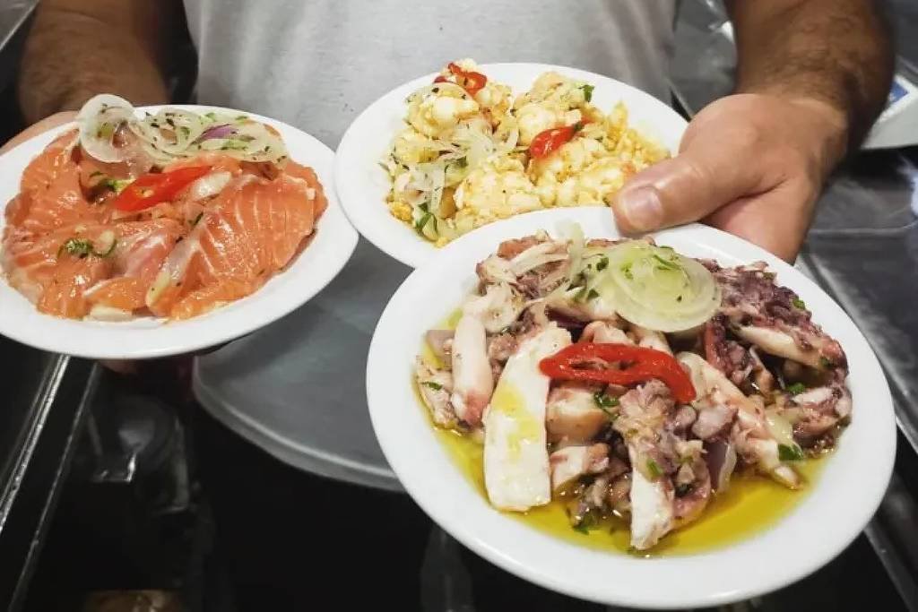 Onde mais encontrar um balcão refrigerado com mais de 60 opções de petiscos fresquíssimos, frutos do mar em sua maioria, servidos a granel em simpáticos pratinhos? A comprida vitrine traz tantas alternativas que o vídeo em que vou andando a passos largos para mostrar, numa tomada só, tudo o que está exposto, dura quase 40 segundos. É muita coisa.
