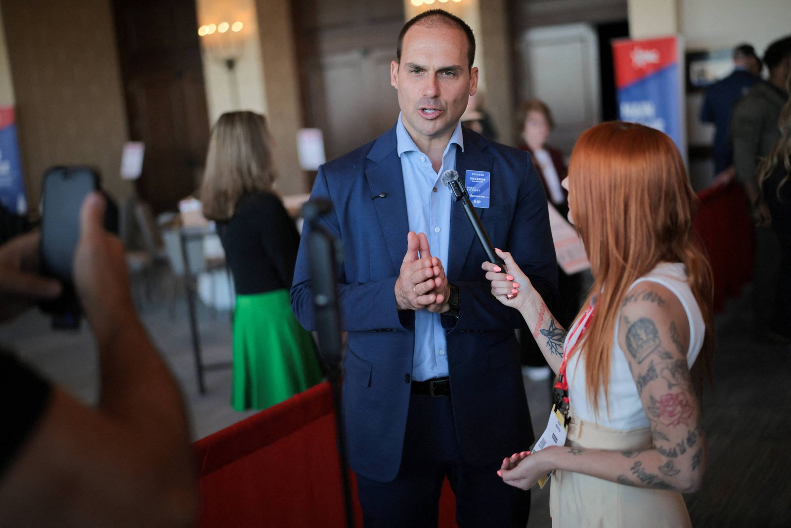 O evento ocorre em um hotel em Dallas, no Texas, até o fim de semana. Eduardo está nos Estados Unidos há um ano e se tornou réu no STF (Supremo Tribunal Federal) sob acusação de coação.