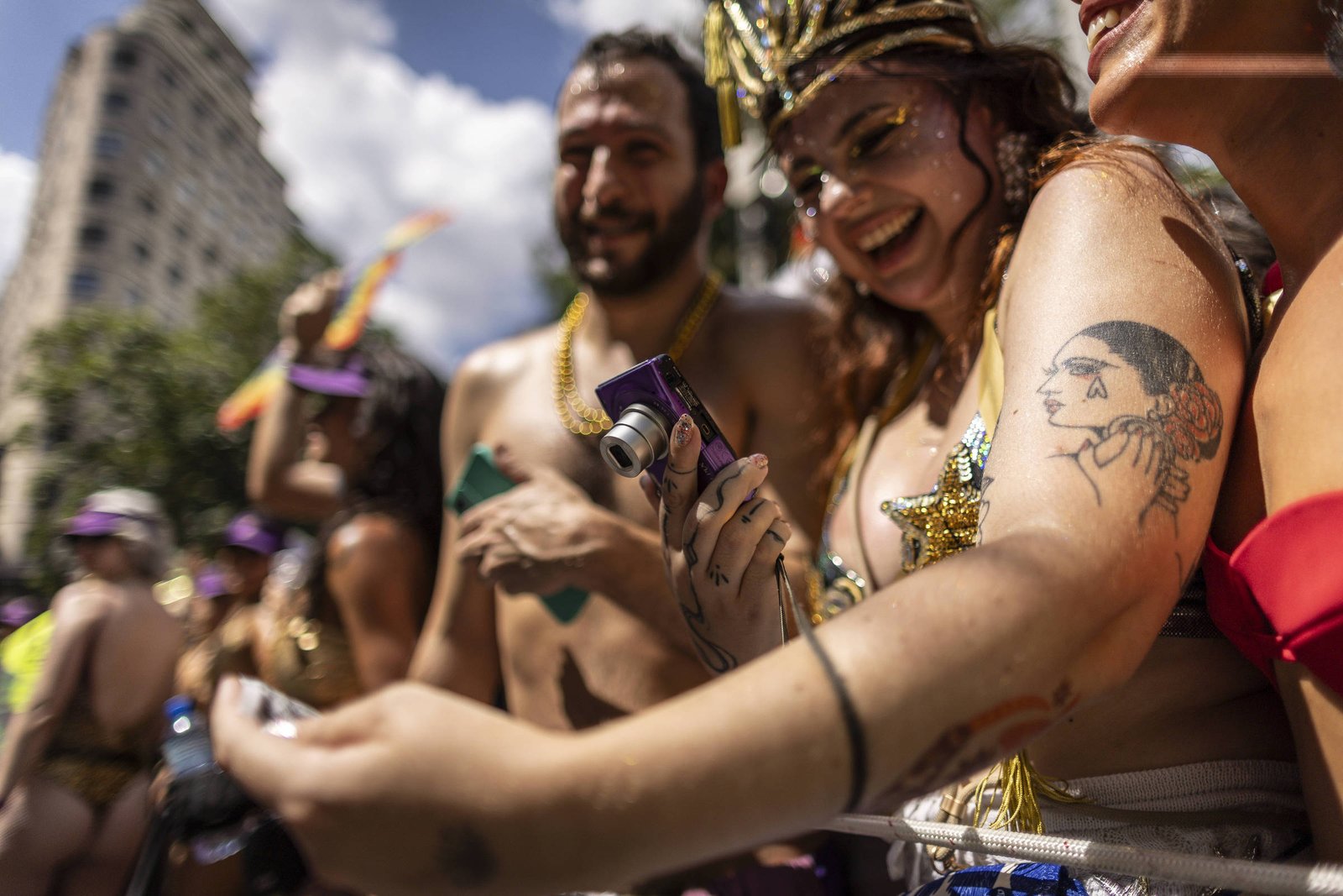 Nos blocos, o equipamento aparece como alternativa ao smartphone e também como parte do visual. O flash direto e as imagens menos nítidas, comuns nesses modelos, têm sido valorizados pelos jovens, que registram amigos e fantasias com a estética característica das câmeras de 20 anos atrás.