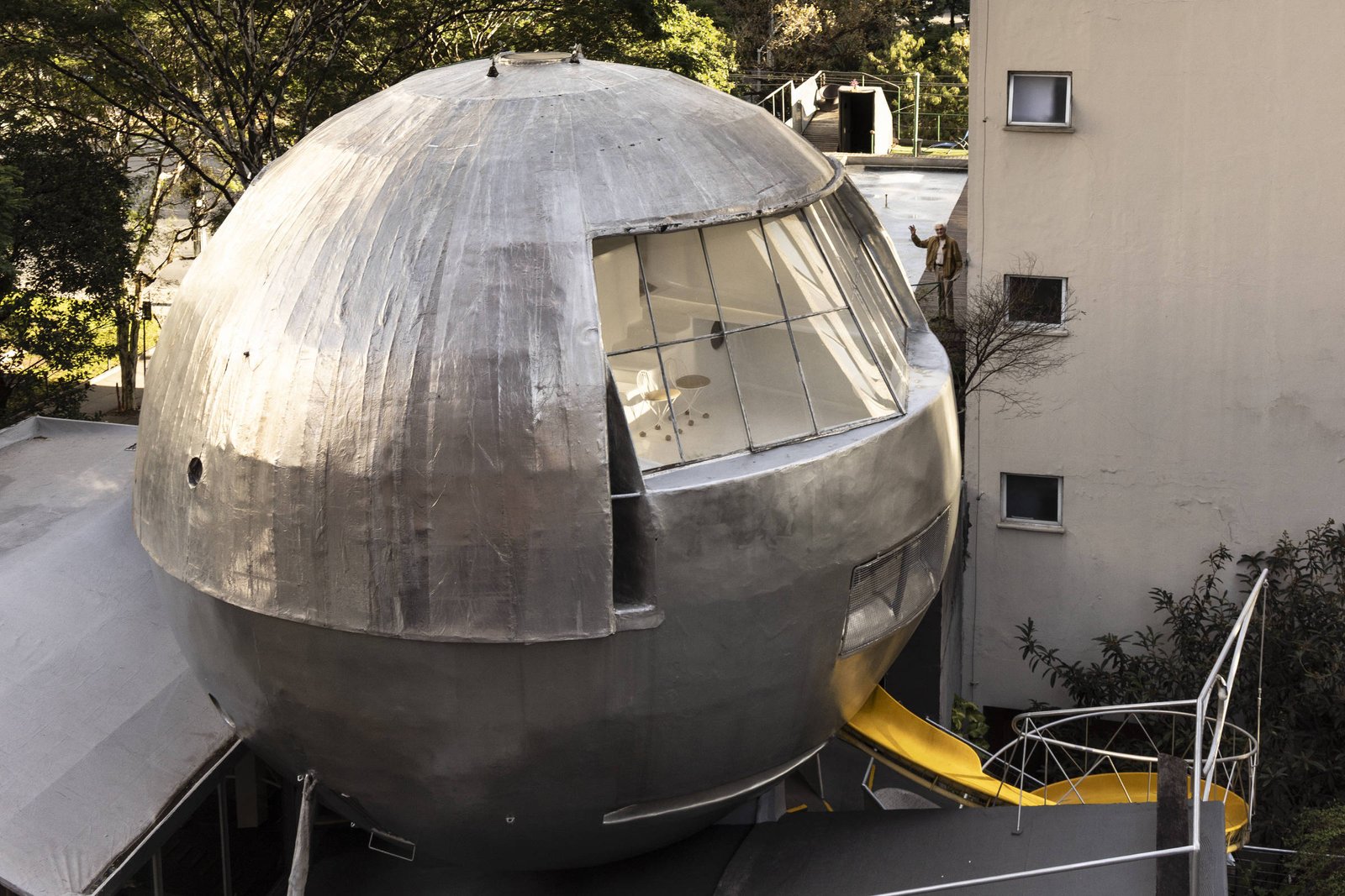 Some-se a isso o invólucro prateado e a construção, da segunda metade dos anos 1970, erguida num período de cinco anos pelo próprio arquiteto, entrega a época era do espaço em que foi feita. “Depois que fiz a bola fiquei com fama de maluco”, diz Longo, em tom bem humorado. “O mundo estava indo para o movimento hippie, de ter menos coisas, ser mais simples. Mas não deu isso. O que vingou foi o movimento yuppie, de ter mais coisas.”
