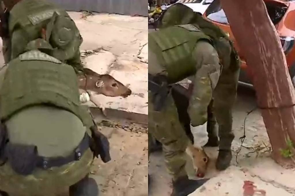 No local, o cervo estava amarrado por um morador a uma árvore pelo pescoço para que não deixasse o local, que fica próximo a avenidas movimentadas e a um hospital.
