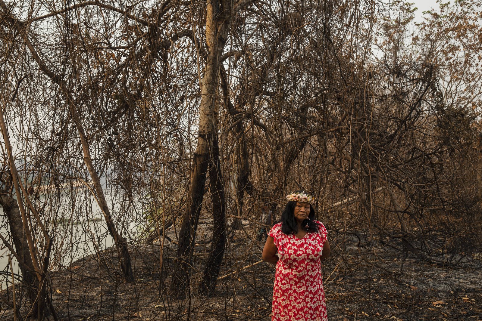 Sandra Guató, moradora da Terra Indígena Baía dos Guató, no Mato Grosso, observa uma área de vegetação queimada perto de sua casa, às margens do rio Cuiabá