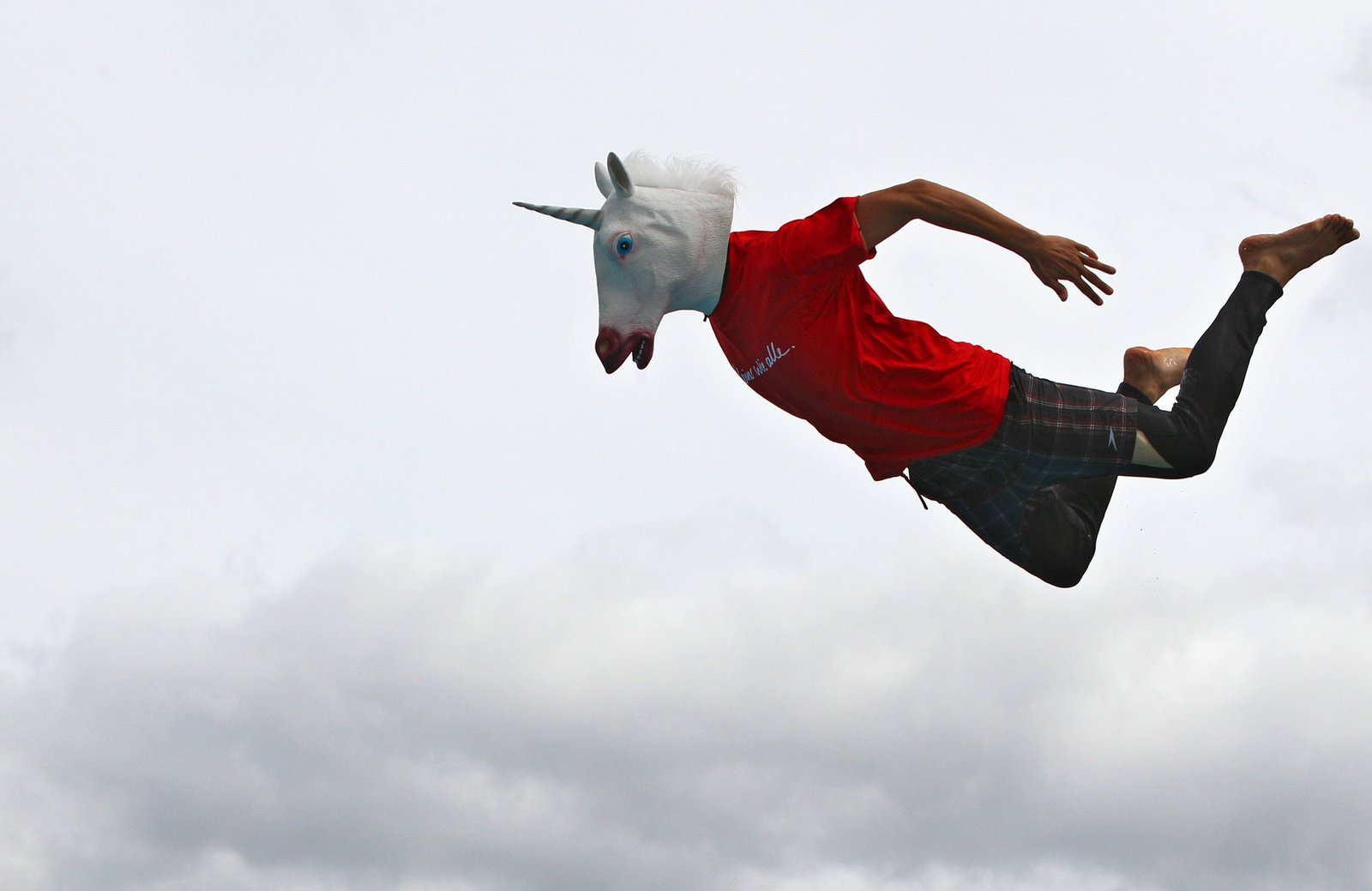 Vestindo uma máscara de unicórnio, jovem salta para mergulhar em uma piscina pública durante competição em Schweinfurt, na Alemanha (foto ilustrativa) — Foto: Karl-Josef Hildenbrand/DPA/AFP/Arquivo