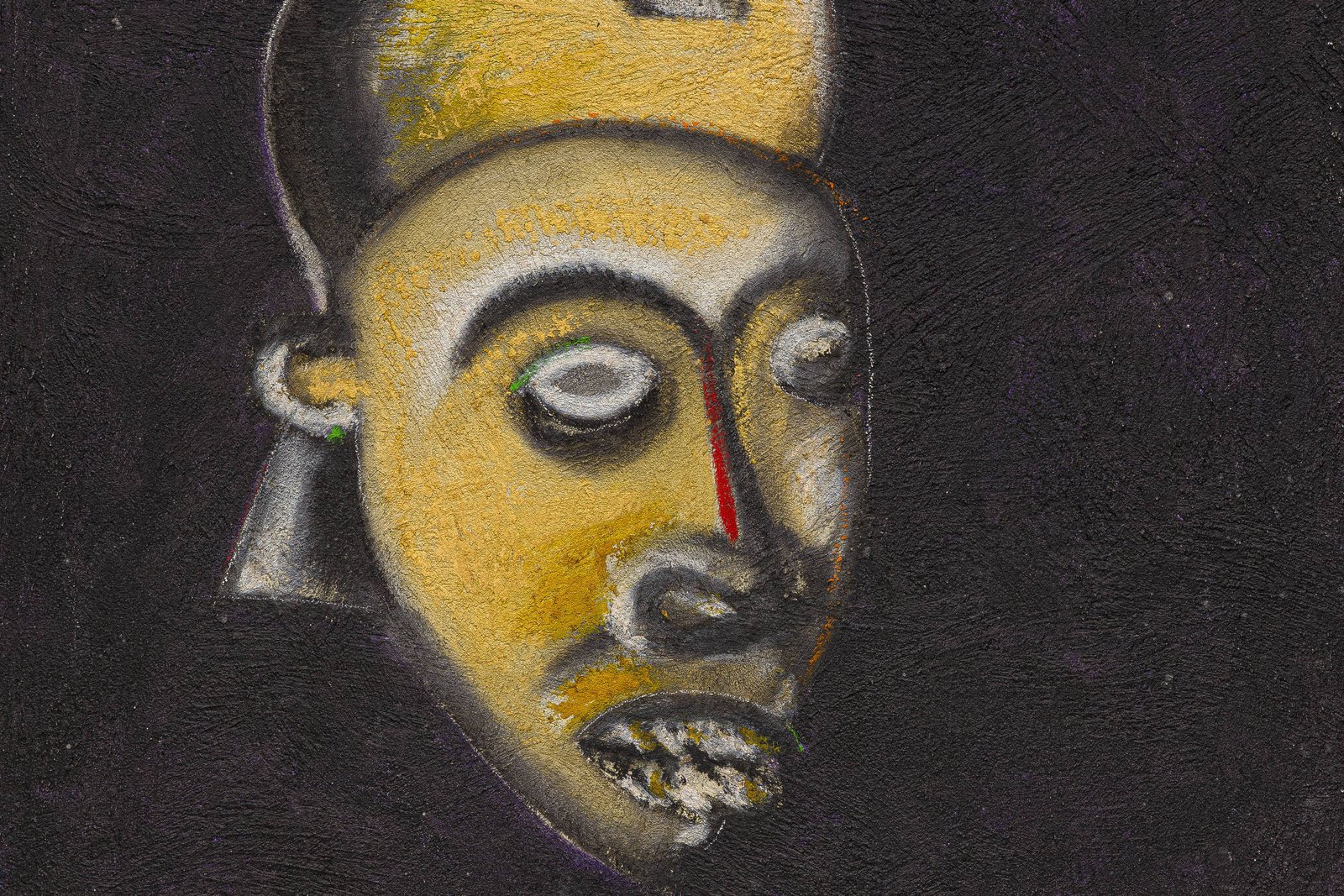 A maior parte das telas, porém, incorpora características presentes em máscaras africanas, como os contornos oblongos e os olhos semifechados. “Esses trabalhos remetem à mãe dele, que tem origem indígena e africana”, diz Milliet.