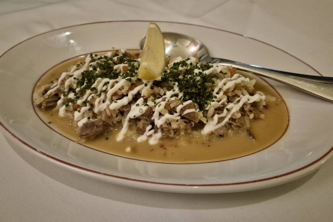 Era um monte alto e comprido de arroz com fiapos de carne desfiada, aïoli, cebolinha francesa e um pedaço de limão. O caldo não envolvia o arroz. Em vez disso, estava em volta dele, formando uma ilha. Um prato feio.