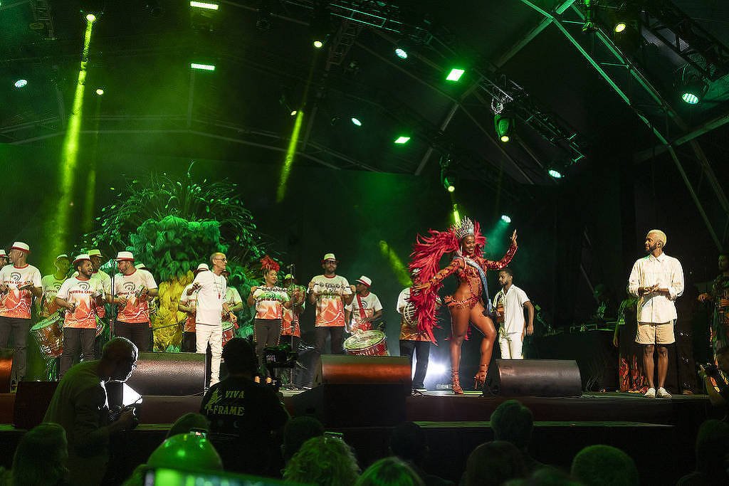 Na terça-feira de temperatura amena na capital paranaense, parte do público arriscou um brilho na roupa e até adereços carnavalescos para assistir a aula-show “Samba: as escolas e suas narrativas”, liderada por Milton Cunha na Pedreira Paulo Leminski. O espetáculo foi criado especialmente para abrir a 34ª edição do Festival de Curitiba, uma das mostras teatrais mais relevantes do país.