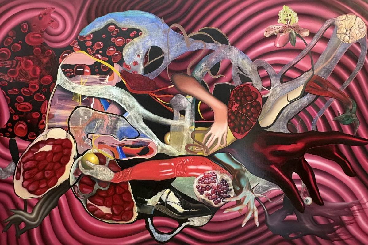 A transfiguração é evidente em “Corpo”, em que Parigi retrata entranhas, membros, células do sistema nervoso e superfícies metálicas, que tensionam os limites entre o homem e a máquina. Braços aparentam sair de um emaranhado de fibras humanas, e nem tudo é literal —sementes de romã se transformam em glóbulos vermelhos, e caules de flores e plantas substituem nervos e vasos sanguíneos.