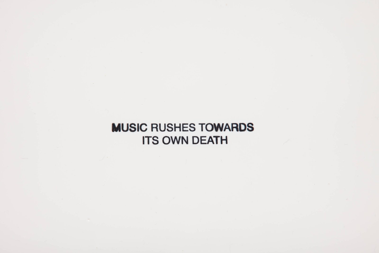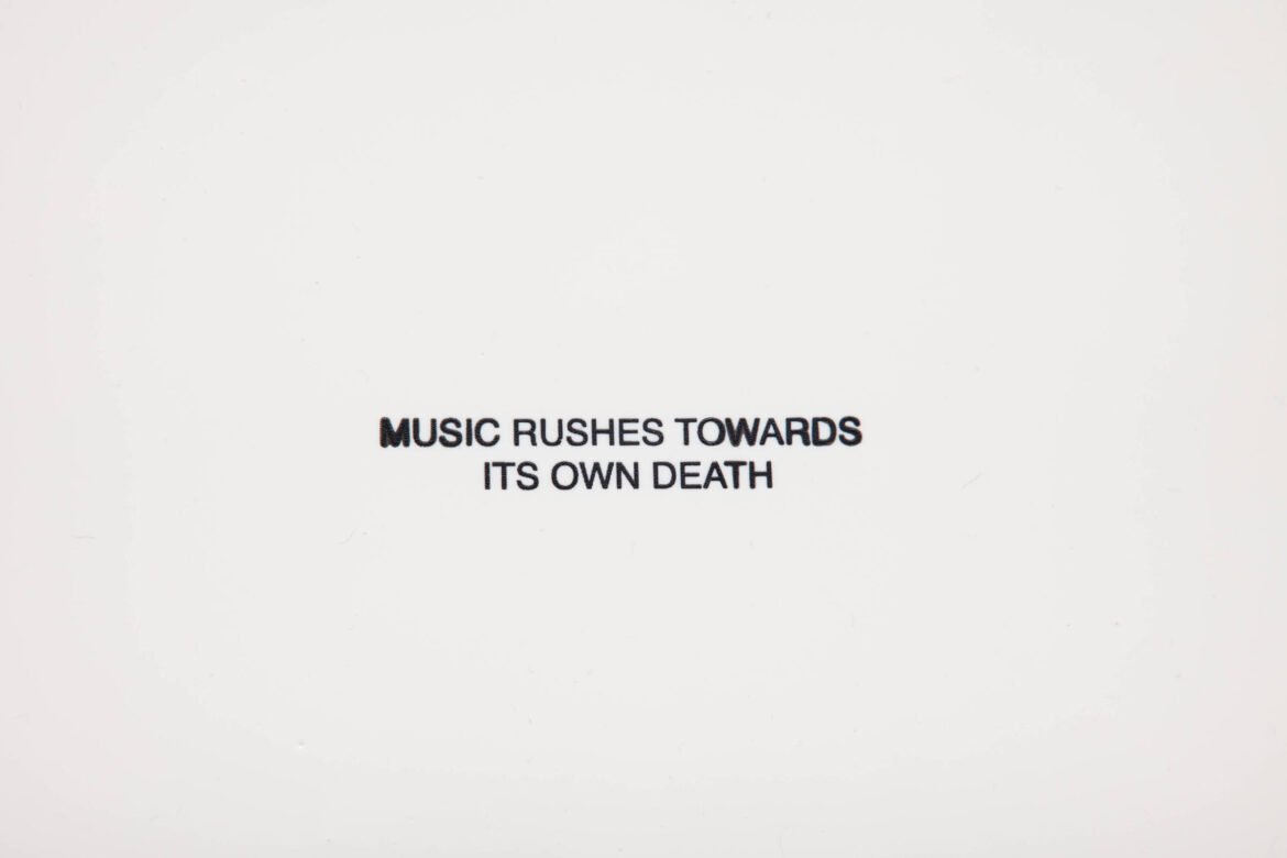Suas resinas não são pinturas, mas o formato delas sugere que estão prontas para serem penduradas na parede. Há quatro na exposição na galeria, com frases como “music rushes towards its own death”, a música se apressa em direção ao seu próprio fim, e “this is ritual space”, este é um espaço ritual, retiradas do livro “Sinister Resonance: The Mediumship of the Listener”, do músico e pensador britânico David Troop.