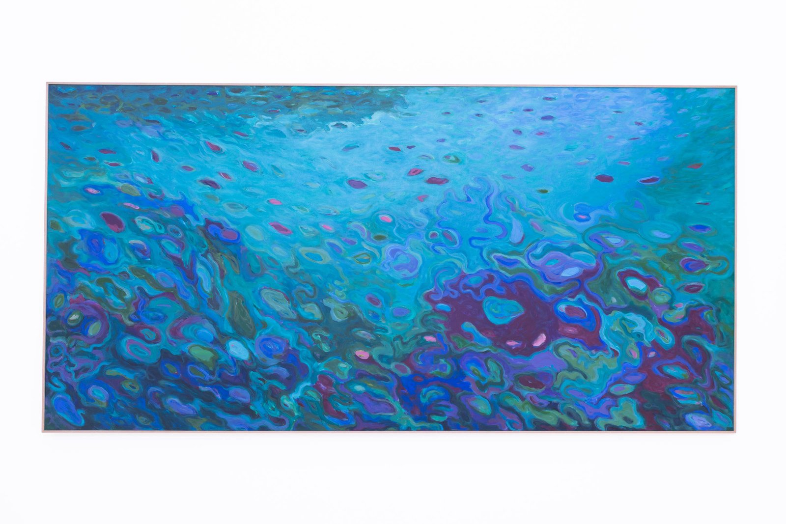 Na tela de Lucia Castanho, formas difusas flutuam sobre um fundo azul, lembrando os movimentos lentos e sinuosos da flora marinha. Olhar para esse trabalho é como mergulhar no mar ou se perder em um devaneio. Já a artista Laura Mattos convida o espectador a explorar a intimidade de espaços domésticos, retratando a superfície imaculada dos azulejos de diferentes banheiros.