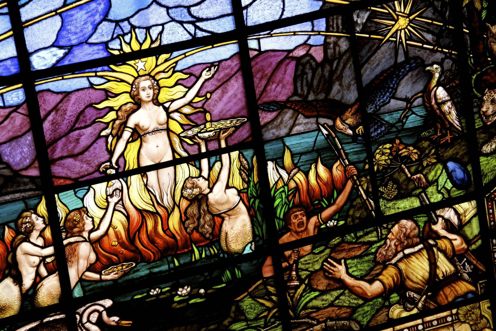 O vitral ocupa o teto do antigo salão do pregão da Bolsa –o coração do imóvel– e funciona como um livro de história visual dividido em três capítulos: a Colônia ao centro; o Brasil Império à esquerda; e a República à direita. Cada seção representa um ciclo econômico que ajudou a construir o estado de São Paulo.
