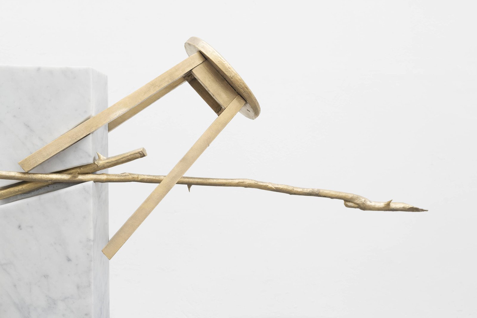 Para o artista de 72 anos, que frequentemente organiza seus trabalhos a partir de coordenadas geográficas ou de acordo com a posição do sol, a linha imaginária também determinou a colocação das esculturas da mostra na galeria. Os pedestais de mármore que sustentam em equilíbrio instável cadeiras e bancos de bronze e ferro não estão paralelos às paredes da galeria, mas sim na diagonal.