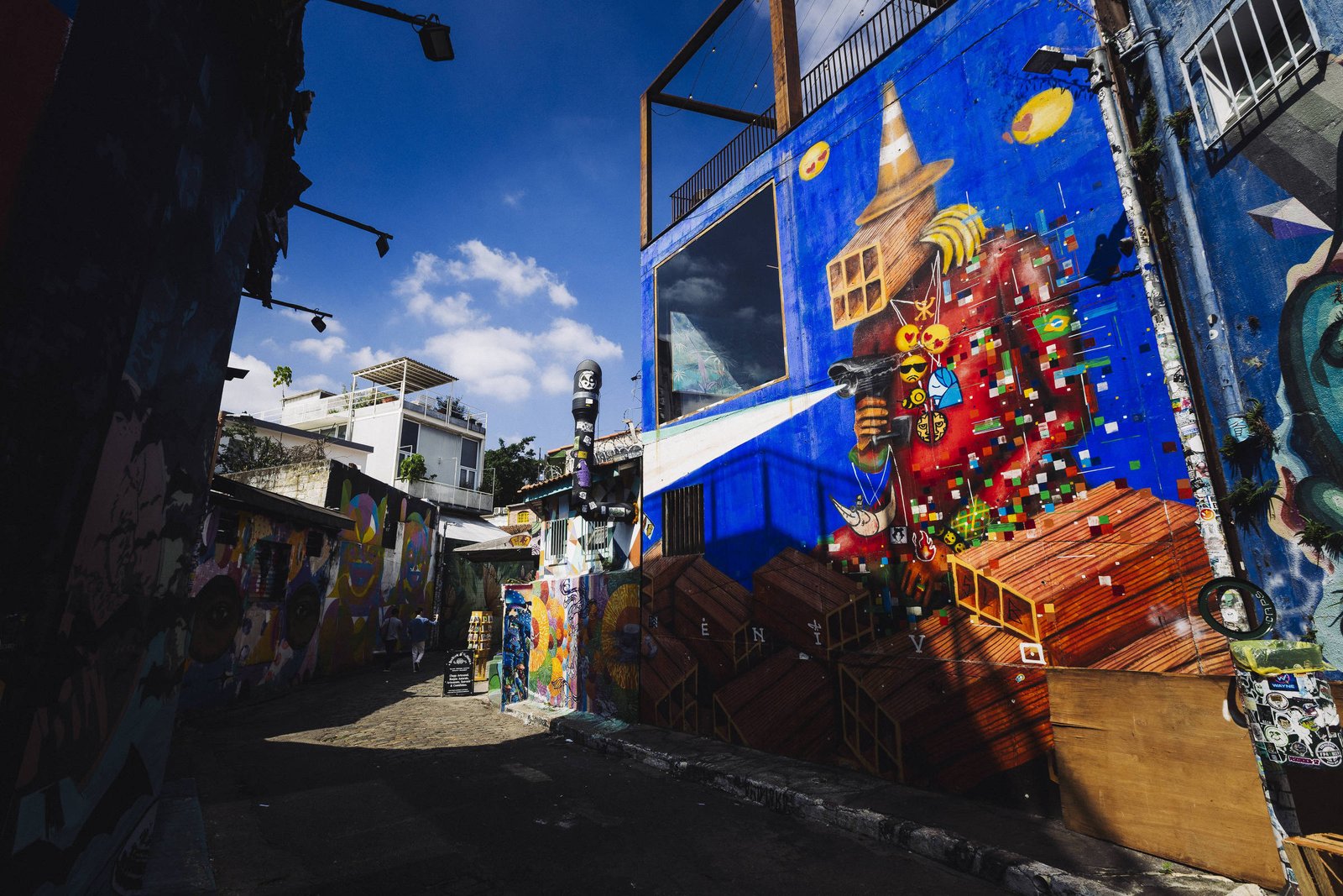 A travessa é também a casa de vários grafites de Alex Senna, cujo estilo reconhecível pode ser encontrado em outros pontos da capital. Um dos que fica por ali é “Baile dos Mascarados”, em que um cortejo excêntrico desfila sobre um fundo amarelo. Já em “Pendulum”, pessoas se equilibram em um semicírculo diante de uma parede vermelha.