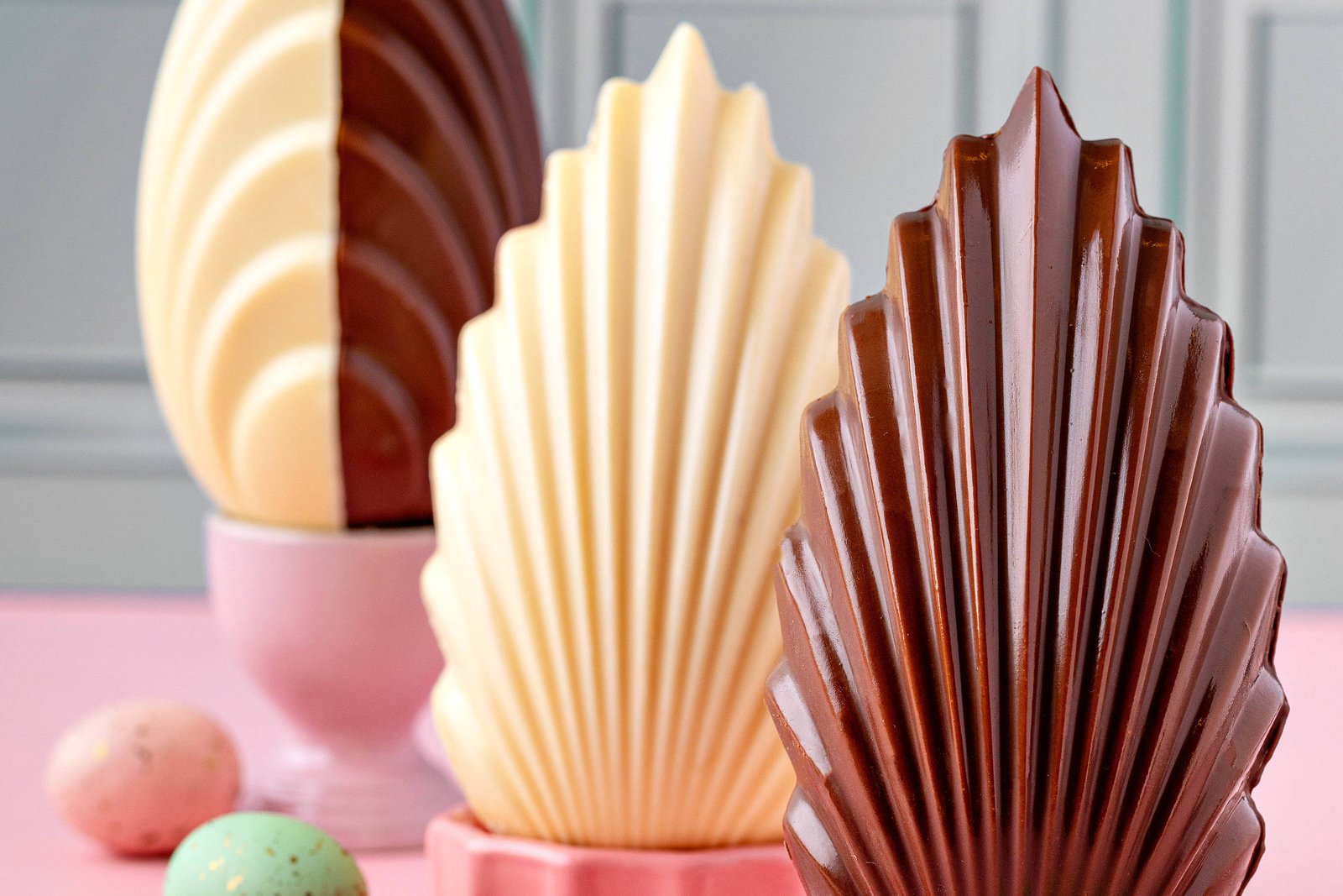 Linha de ovos de Páscoa em formato de concha da Michele Confeitaria.