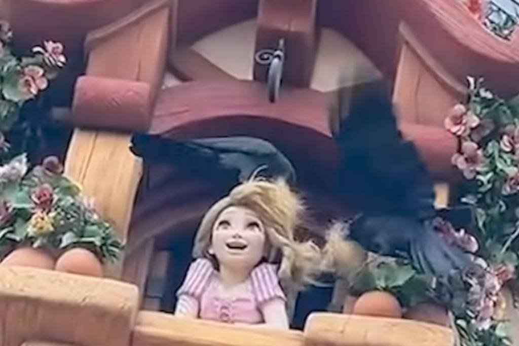 Recentemente, dois corvos chamaram a atenção e assustaram visitantes do Tokyo DisneySea. Isso porque as aves cortaram o cabelo de um robô da personagem Rapunzel que estava no alto de uma torre temática.