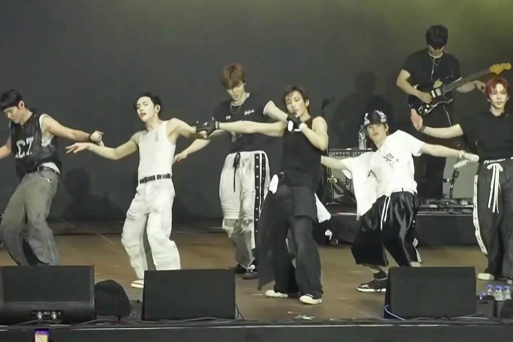 Quando os ídolos perguntaram quem da plateia esteve no show solo que eles fizeram na quinta (19), no Terra SP, quase todos que estavam próximo ao palco levantaram as mãos. Muitos dos presentes, inclusive, vieram de outros países. Alguns fãs balançavam “lightsticks”, bastões de luz que são típicos do k-pop —cada artista tem o seu próprio.
