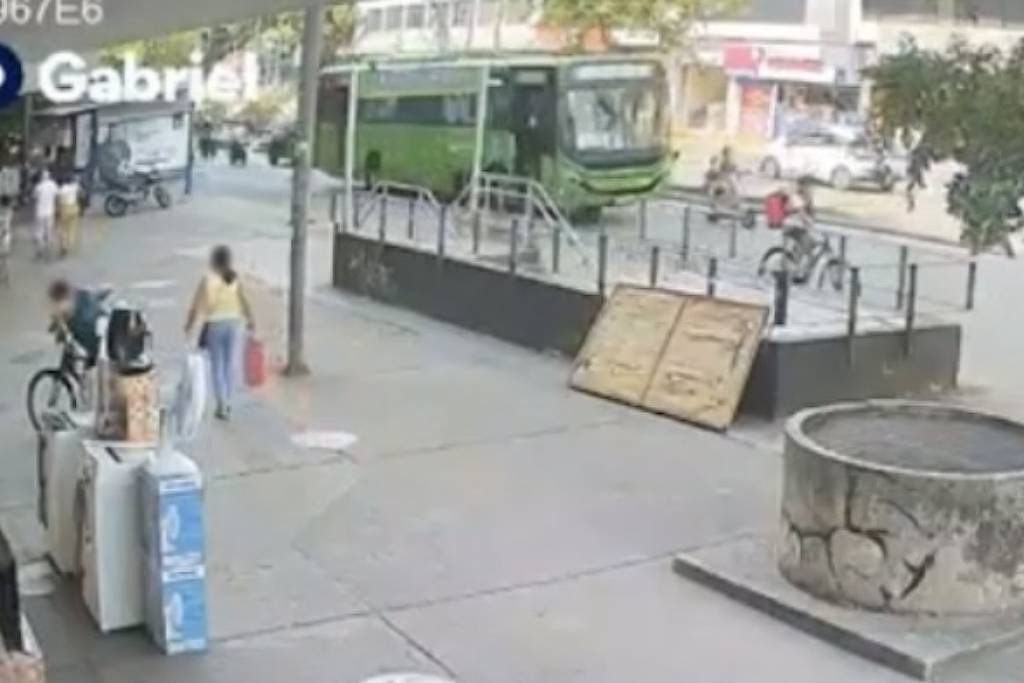 Segundos depois, mãe e filho reaparecem já caídos no asfalto. Pessoas que estavam próximas correm para prestar socorro, enquanto o ônibus para alguns metros à frente.